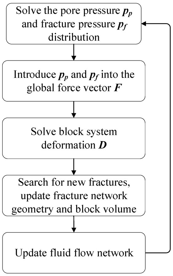 An iteration scheme is developed to achieve the hydromechanical coupling, which is shown in Figure 2. Firstly, the fluid pressure distribution within the rock matrix and fractures is calculated. Then, the fluid pressures within fractures and the matrix are incorporated into the global force vector , and DDA calculations are performed to obtain the total deformation variables of the block systems. Then, the contact relationships between blocks are checked to determine whether new fractures are generated. At the same time, the fracture aperture and the block volume are calculated to update the fluid cavity volume and fracture permeability. In addition, the fluid flow network including fracture seepage channels and pore seepage channels is also updated according to the fracture network. This iterative procedure continues until reaching the final time step.