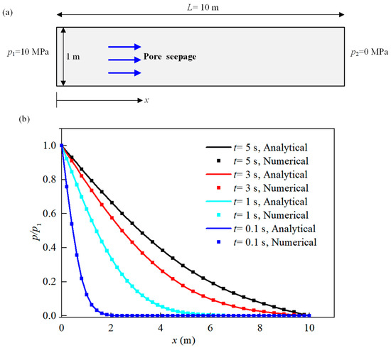 Verification against the analytical solution of unsteady pore seepage. (a) Computational model, (b) comparison between numerical and analytical results of pore pressure.