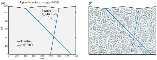To examine the developed model in simulating mixed pore–fracture seepage, a standard example by Tatomir [34] is employed here. The model is shown in Figure 4a. The upper boundary is defined as a pressure boundary, and all other boundaries are impermeable. The dimensions of the model and pressure boundary settings, as well as the permeability value, are illustrated in Figure 4a. The model mesh is presented in Figure 4b.