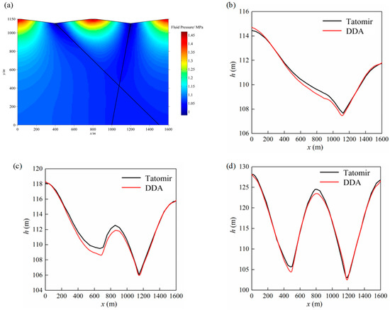 The fluid pressure distribution obtained from the numerical simulations is depicted in Figure 5a. We compare the simulated hydraulic head (, where is water density, , and is gravity acceleration, ) at different elevations () with the results of Tatomir [34]. As depicted in Figure 5b–d, the numerical results align closely with those of the standard example. Thus, this example demonstrates that the proposed model can accurately simulate the fluid pressure distribution in fractured porous media.