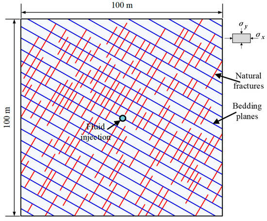 The model shown in Figure 6 represents a vertical section of the rock masses in the Longmaxi shale formation. The model considers both natural fractures and bedding planes, while the rock matrix is regarded as a porous and permeable medium. In this model, the natural fractures and bedding planes are reconstructed based on statistical measurement data obtained from an outcrop of the Longmaxi shale formation in the Sichuan Basin [30]. According to outcrop observations, the natural discontinuities in the Longmaxi shale reservoir mainly consist of one set of bedding planes and one set of high-angle fractures, which are approximately perpendicular to the bedding planes. In the reconstructed model illustrated in Figure 6, the bedding planes are uniformly distributed with a dip angle of 30°, and the average trace length of high-angle natural fractures is 15 m. To consider the influence of discontinuities on fracturing, natural fractures and bedding planes are initially treated as weak planes with very low strengths and seepage paths with relatively high permeabilities. Fracturing fluid can permeate into the surrounding rock masses, which may affect the fracturing processes and fracture configurations. The model was meshed using triangular elements with fine refinement in simulations. Fracturing fluid is injected into the center of the rock mass consistently. Table 1 presents the mechanical parameters of the Longmaxi shale and the parameters used in the fracturing process simulations.