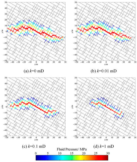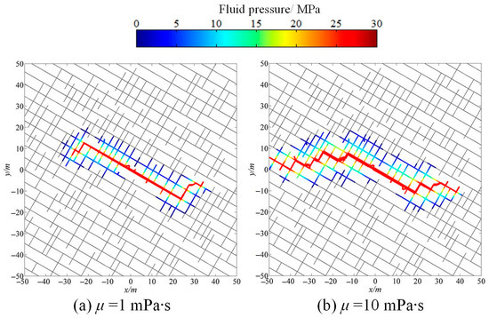 According to the above numerical results, it can be concluded that rock permeability plays a critical role in the fracturing processes. In reservoirs characterized by higher permeability, it is vital to reduce the fluid leakoff volume during the fracturing process to enhance the overall fracturing efficiency. Improving the viscosity of fracturing fluids is commonly used as a strategy to decrease the volume of fluid leakoff. Here, the effectiveness of augmenting the fluid viscosity in minimizing fluid leakoff is investigated through numerical simulations. Figure 13 shows the simulated fracture network configurations under different viscosities of fracturing fluids, while Figure 14 illustrates the variation in the stimulated fracture length and fluid leakoff volume. It can be observed that when the fluid viscosity is improved, the volume of fluid leakoff significantly decreases (Figure 14b), while the stimulated fracture length obviously increases (Figure 14a). Furthermore, as shown in Figure 13, the improvement in the fluid viscosity enhances the fluid net pressure inside the fractures, leading to a more complex fracture network morphology and a larger stimulated reservoir area. Hence, improving the fracturing fluid viscosity is useful in reducing the fluid leakoff volume and increasing the fracturing efficiency.