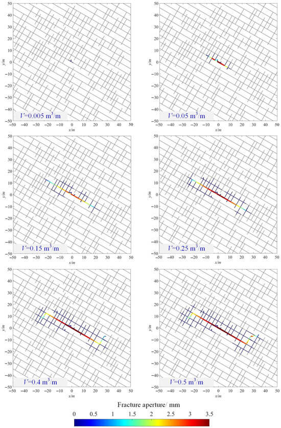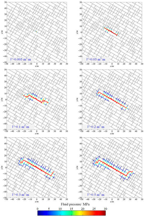 As previously discussed, higher rock permeability induces significant alterations in the hydraulic fracture network configurations. To further explore the extension processes of hydraulic fracture networks, an in-depth analysis is undertaken, focusing on the permeability condition of . Figure 9 illustrates the fluid pressure evolution processes of hydraulic fracture networks during fluid injection, while Figure 10 illustrates the fracture aperture evolution processes. In addition, Figure 11 delineates the relation between the fracture length and fluid injection volume under the condition of , alongside a comparative depiction of the fracture length evolution at . Generally, hydraulic fracture networks expand rapidly during the initial phase of fluid injection, then the expansion decelerates notably. Specifically, the main fracture initially propagates along the adjacent bedding planes towards the injection point, extending rapidly during the initial injection phase. At this stage, most of the injected fluids are contained within the main fracture, resulting in a significant increase in the fracture aperture due to high fluid pressure. Subsequently, surrounding natural fractures are activated, and the main fracture gradually reorients towards the horizontal direction, aligning with the orientation of the maximum principal stress. While the main fracture length increases, the aperture of the main fractures reaches its maximum value, and the aperture of the activated natural fractures remains relatively small. The overall morphology of the fracture network conforms to the orientation of bedding planes, diverging from the morphology observed at (Figure 7b). According to the above simulation results, it can be deduced that because of the presence of relatively high permeability, fractures tend to propagate along preferential structural planes, thereby diminishing the influence of in situ stress.