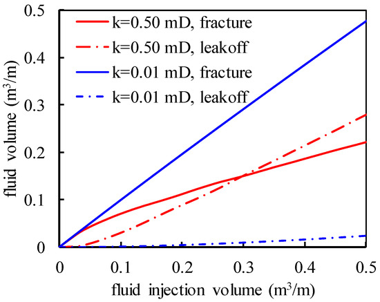 The variation in fluid volume within fractures and fluid leakoff volume with fluid injection volume ().