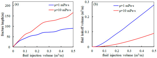 The variation in (a) stimulated fracture length and (b) fluid leakoff volume under different fluid viscosities.
