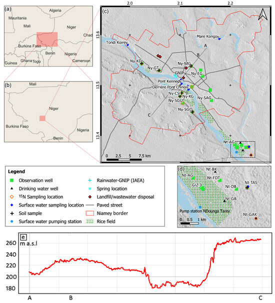 Groundwater serves as a crucial source of potable water for both urban and rural populations. In many African regions, due to the lack of water and sanitation services, along with the absence of piped systems, groundwater resources are increasingly vulnerable to anthropogenic contamination [1]. Water quality data and their consequent linkage to the origin are scarce especially for African countries. Contamination with nitrate (NO3−) in highly urbanised areas caused by anthropogenic influence was reported by several studies for West African countries. Ohou et al. reported NO3− concentrations from the Ivory Coast, which exceed the thresholds suggested by the World Health Organization (WHO), due to the impact of wastewater in the region [2]. In Yaounde, Cameroon, groundwater quality was proven to be influenced by infiltrating wastewater [3]. Similarly, elevated NO3− concentrations were measured in the aquifer used for water supply in N’Djamena, Chad [4]. Several wells in the area of Niamey in Niger, which belong to the continental terminal aquifer and the basement aquifers, have been shown to be influenced by wastewater contamination [5,6,7,8,9].