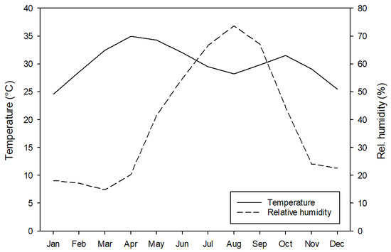 The monthly average temperature and relative humidity were determined using climate data provided by [19] for the period between January 2013 and December 2018 (Figure 2). The average air temperature ranges between 25 and 35 °C. The temperature can reach 40 °C between March and May and may decrease to 15 °C in December. The relative humidity reaches its average maximum in August with 73%, and the lowest values occur during the hottest months between March and May.