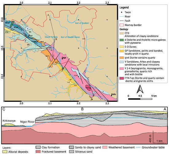 Geological map for the area of Niamey with the main geological units (modified after [22]), where the lower figure represents a schematic hydrogeological cross-section through the line A-B-C (modified after [9]).
