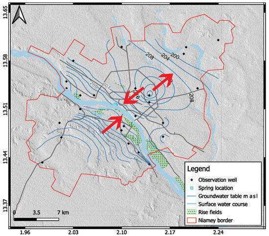 Static water levels were measured in the wells of Niamey aquifers on both sides of the Niger River [12]. They indicate that the water divide is associated with the topographic watershed on the plateau area NE of Niamey and that the groundwater flow direction is towards the river, which was similarly described by other authors [6,7,8,9,31,32,33]. According to [9], the flow regime is not homogeneous and local flow systems (e.g., the effluent conditions in the area of Gount Yantala) exist, which are mainly controlled by topography (Figure 4). Some springs that emerge from the basement aquifer have been documented during field work on the NE side of the Niger River where the flow gradient becomes steep. The discharge of two springs was measured in December 2022 with 1.3 and 0.3 L/s. The groundwater flow on the southwestern part of the river (the plain side) implies an interrupted regime within the fractures [5,31,32,33].