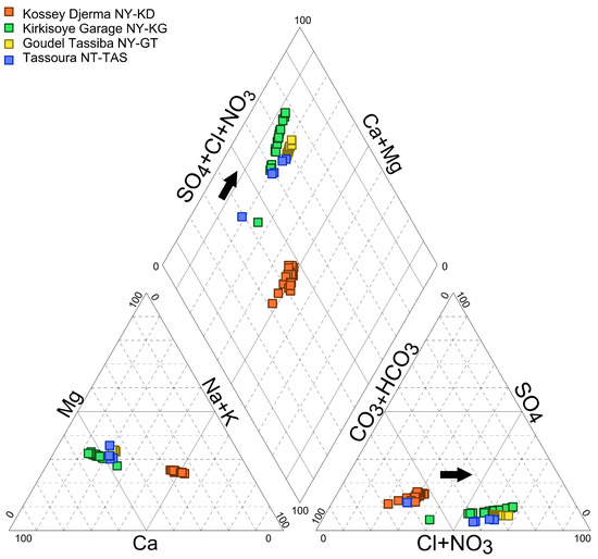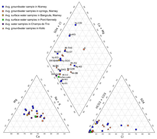 Most groundwater samples in Niamey and Kollo belong to the Ca-Mg-HCO3 type (Figure 5). The dominating anion for most of the samples is HCO3; however, groundwater from the locations of Ny-KG, Ny-CSI, Ny-GT, Nt-TAS, and GIZ-4 falls into a chloride domination type. Surface water from the Niger River plots within the Ca-Mg-HCO3 type but with a much lower dissolved mineral content in comparison to groundwater samples. Koris Bangoula (SW-BAN) and Koris Champs de Tire (SW-Cdt) are two permanent water ponds located in the NW part of Niamey. The samples of SW-BAN plot among the groundwater samples and show a higher mineral content compared to other surface waters. Samples stemming from SW-Cdt plot among the surface water samples. Groundwater samples from Kossy Djerma in Niamey (Ny-KD) together with samples from Abara Gongoun (Nt-AG) and Gala Beri (Nt-GB) plot in the area of no dominating cation type; however, these samples have higher concentrations of Na and K compared to other samples.