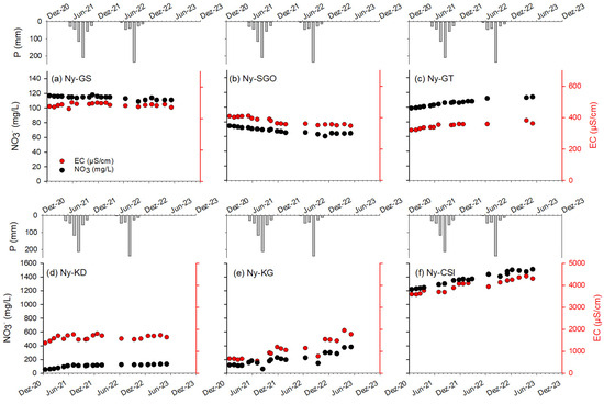 Several factors may influence the groundwater flow and composition in the fractured aquifers and their weathered fringes [41]. A continuous increase in EC values together with Cl− and NO3− concentrations is observed in groundwater extracted from wells (Ny-KD, Ny-KG, Ny-GT, Nt-TAS) (Figure 11). A slight increase in Ca concentrations can be observed in Ny-KG.