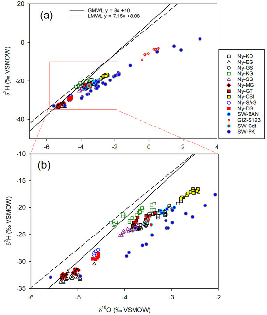 While most of the groundwater samples plot close to the regression line, the samples belonging to Ny-KG plot close to the LMWL and the GMWL. δ-values are increasing over the observation period at all sampling locations (Figure 7b, Supplementary Materials).