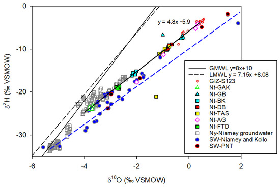 Groundwater and surface water samples from the Kollo region are plotted together with the samples from Niamey in Figure 8. Groundwater from the Kollo region also plots on a line with a slope of 4.8, lower than for groundwater samples from Niamey. Most of the groundwater samples tend to be more positive, with values between −0.5 and −10‰, compared to values between 0.6 and −3‰ for groundwater from Niamey. Samples belonging to Nt-GAK and Nt-FDT plot among those from Niamey.
