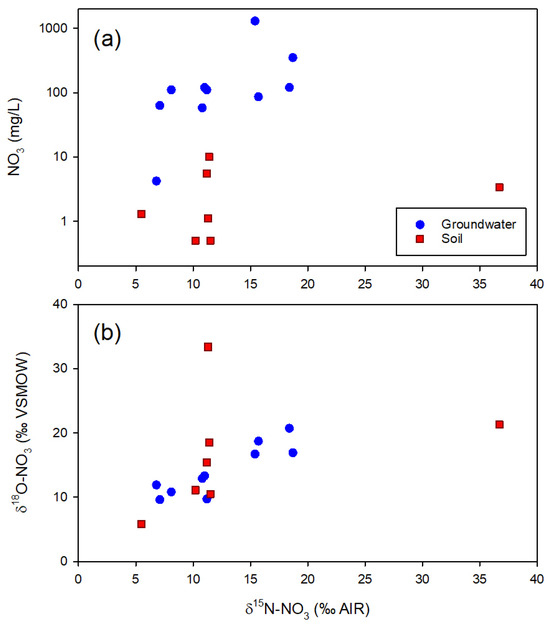 Relationship of (a) δ15N-NO3 values vs. NO3− concentrations and (b) δ15N-NO3 vs. δ18O-NO3 values for groundwater and soil samples from Niamey and Kollo, Niger.