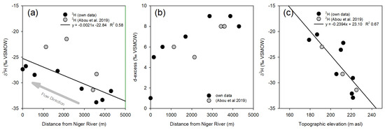 (a) δ2H values and (b) d-excess values vs. distance from Niger River. (c) δ2H values vs. topographic elevation. Four additional locations were added from [12].