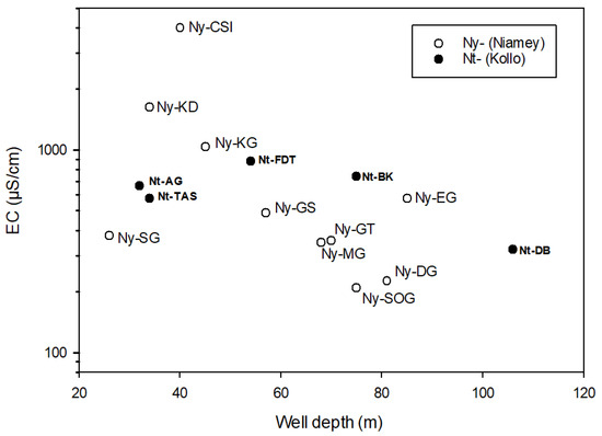 Given the wells are not fully penetrating to the base of the bedrock aquifer, the flow during pumping is not strictly lateral towards the well; instead, there is a vertical component from below. The increase in EC together with Cl− and NO3− suggests that groundwater entering the wells from deeper parts of the aquifer might be more mineralised than the groundwater closer to the surface. This implies that the EC values increase with an increasing depth in the aquifer. Moreover, the depths of the wells vary strongly, in particular, between the SW part of the region where wells Ny-KG and Ny-SCI are located and the rest of the wells in the NE part. Hassane et al. (2016) [9] gave an estimation for the thickness of the weathered fringe to be approximately 100 m in the area of Kirkossye and 400 m on the plateau side (Figure 3). To trace the possible changes in groundwater quality with increasing depths, the average EC values measured over the observation period were plotted as a function of the well depth (Figure 12). The wells with greater depths between 70 and 80 m in Ny-MG, Ny-DG, and Ny-GT showed much lower EC values compared to those at shallow depths. Considering the whole range of the EC values, two outliers can be observed in Figure 12: Ny-CSI and Ny-SGO. This probably indicates that the change in the EC at these two locations is related not only to the influence of the lithology but also to anthropogenic effects.
