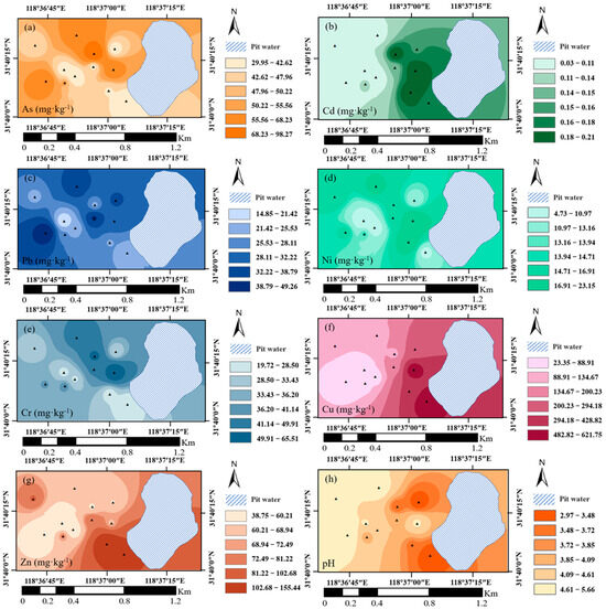 Maps of As (a), Cd (b), Pb (c), Ni (d), Cr (e), Cu (f), and Zn (g) concentrations and pH value (h) in the study area.
