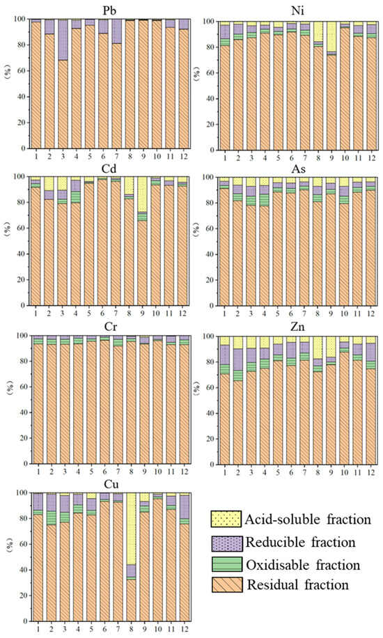 The mobility and availability decrease in the order of acid-soluble fraction > reducible fraction > oxidizable fraction [46]. The PTE fractionations of Pb, Ni, Cd, As, Cr, Zn, and Cu in the soil samples are shown in Figure 4, and the results are described in terms of the percentage distribution. Acid-soluble fraction PTEs are mobile and bioavailable, leading environmental threats to nearby soil and water. Therefore, the percentage of acid-soluble fraction indicates the migration risk of PTEs. According to Figure 4, the largest percentage of all the PTEs (except for sample 8 from Cu fractionation) is the residual fraction. The acid-soluble and reducible fraction of Pb are less than 1%, and several samples possess a certain percentage of reducible Pb. For As and Cr, the fractionation difference among different samples is small. The acid-soluble fractions of Cr samples are less than 1%, and for As they are between 2 and 7%. For Ni, Cd, Zn, and Cu, there are obvious differences between samples 8, 9, and other samples. The acid-soluble fractions of sample 8 and 9 of Ni, Cd, Zn, and Cu are 15.8% and 23.6%, 13.9% and 27.5%, 17.6% and 16.2%, and 56.0% and 6.7%, indicating great migration risk of PTEs. Considering the great proportion of the acid-soluble fraction of Cu in sample 8 (56.0%), site 8 might possess a higher amount of copper ore than other sites, and site 8 was the primary Cu pollution source of the study area. Moreover, the soil at site 8 was more porous than other sites, which accelerated the corrosion of copper ore. Though the contents of Cd, Ni, and Zn in soil are not high, given the large area of the mine, the leaching amount of acid-soluble PTEs could accumulate and cause damage to the environment [47]. It can be seen from Figure 1 that there are ponds and farmlands on the north side of the bare mine, which are only several hundred meters away from the mountain. PTE ions would transport with rainfall to the nearby ponds and farmlands. With the progress of agricultural activities, PTEs might accumulate through the food chain and threaten human health [48].