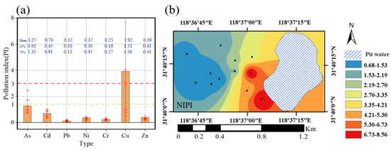 PI values (a) and map of NIPI values (b) of PTEs in the study area.