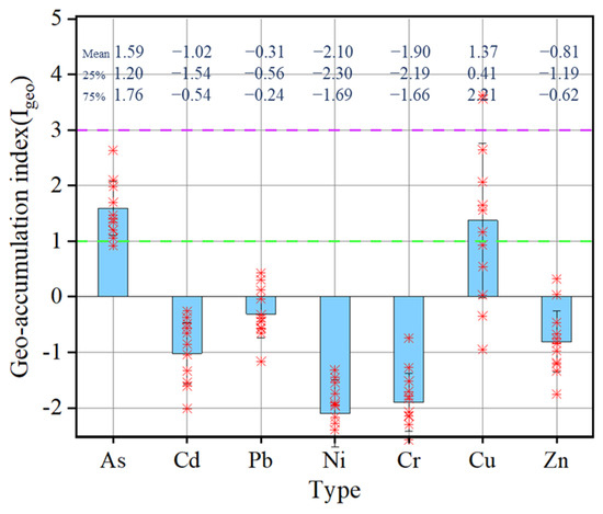 Figure 6 presents the Igeo values of PTEs in the study area. According to the results, the average Igeo values of Cd, Pb, Ni, Cr, and Zn were below 0, indicating that the overall pollution level of these PTEs was practically uncontaminated. The average Igeo values of As and Cu were between 1 and 2, reaching the pollution level of moderately contaminated, and certain sites showed higher environmental risk of 2 < Igeo < 4, reaching the pollution level of moderately to heavily contaminated and heavily contaminated. As Igeo is calculated to assess the PTEs’ accumulation degree in soil, the accumulation level of As and Cu in the study area is high.