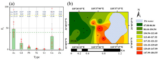 Ei values (a) and map of PERI values (b) of PTEs in the study area.