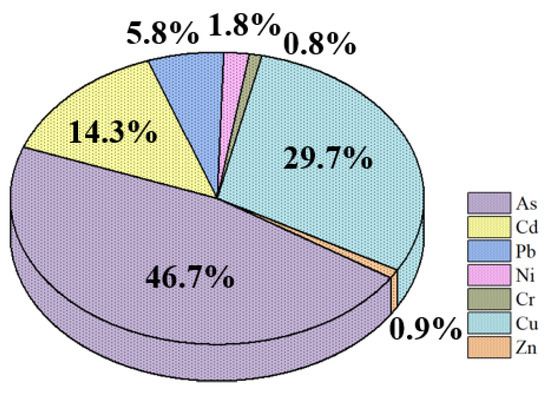 Figure 7 presents the Ei values(a) and the map of PERI values of PTEs in the study area. According to the Ei values, the average Ei value of As was the highest, reaching the level of intermediate pollution, and other PTEs’ pollution was at the level of slight pollution. The Ei values of an As sample and two Cu samples were more than 80, reaching the level of strong pollution, which indicated that the pollution level of the study area was uneven. From the map of PERI values, the highest PERI value was at sampling site 8, reaching the level of intermediate pollution. Pollution of the bare part in the middle of the mine was more serious than that of surrounding areas, leading to a great threat to the nearby plants and soils if no appropriate remediation method was applied in time. According to Figure 8, the contributions of As, Cu, and Cd to the PERI value of the whole study area were 46.7%, 29.7%, and 14.3%, respectively, which accounted for a 90% pollution risk for the study area. Therefore, most of the remediation attention should be paid to the three kinds of PTEs in the future.