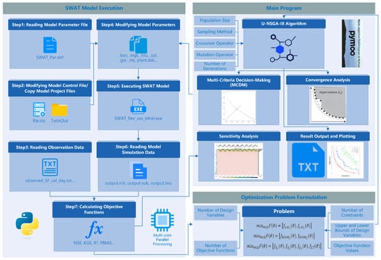 This paper is organized as follows: Section 2 introduces the SWAT model, the U-NSGA-III algorithm, and the overall design and specific implementation of the Py-SWAT-U-NSGA-III framework. Section 3 conducts sensitivity analysis, evaluates the parallel efficiency of the framework, and presents three typical case studies (including multi-site, multi-variable, and multi-objective functions calibration) in the Meijiang River Basin in southern China. Section 4 discusses the results and summarizes the advantages, limitations, and future directions of the framework. Finally, Section 5 presents the conclusions. We have provided the source code for the Py-SWAT-U-NSGA-III framework as an open-source and freely available repository through GitHub: https://github.com/Huihui-Mao/Py_SWAT_U-NSGA-III/tree/master (accessed on 30 August 2024).