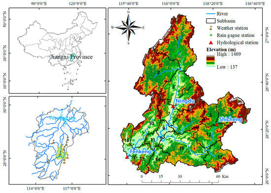 The datasets used in this research are listed in Table 1. The basic datasets required for the SWAT model include topographical data (DEM), land use data, soil data (including soil type and soil attribute data), and meteorological data. There is a difference between the original land use types and the land use types used in the SWAT model. It was necessary to reclassify the land use data of the study area to match the land use type map required by the SWAT model. The soil type data were obtained from the 1:1,000,000 Soil Map of the People’s Republic of China, provided by the Resource and Environmental Science Data Platform. Soil attribute data include soil texture, clay content, silt content, sand content, gravel content greater than 2 mm, bulk density, organic carbon content, soil pH, and soil thickness, and vertically include five soil depths: 0–5 cm, 5–15 cm, 15–30 cm, 30–60 cm, and 60–100 cm. The meteorological data required for the SWAT model include daily precipitation, daily maximum and minimum temperatures, daily solar radiation, daily relative humidity, and daily average wind speed. This study used daily meteorological observation data from 2001 to 2011 from eight meteorological stations (Ganxian, Yongfeng, Nancheng, Nanfeng, Ningdu, Guangchang, Ninghua, and Changting) located within or near the watershed, provided by the China Meteorological Data Service Center. Solar radiation data were calculated using the Ångström-Prescott model based on sunshine duration and empirical parameters [,]. Missing values were estimated using the SWAT built-in WXGEN weather generator []. Daily observed precipitation data from 37 stations and daily observed streamflow data from three hydrological stations (Ningdu, Shicheng, and Fenkeng) between 2001 to 2011 were also collected from the Annual Hydrological Report (Volume VI: Hydrological Data of Changjiang River Basin). The distribution of meteorological, rainfall, and hydrological stations is shown in Figure 2.