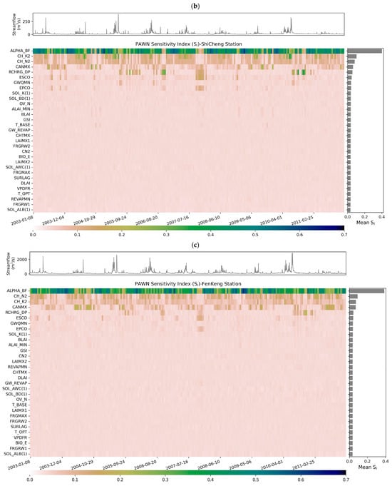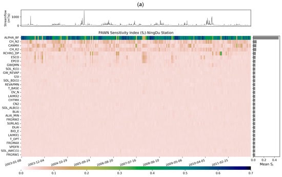CH_N2 and CH_K2, both related to the main channel water routing, exhibit higher sensitivity during streamflow peaks. CH_N2, Manning’s roughness coefficient, affects the rate and velocity of flow in the channel, whereas CH_K2 influences transmission losses from the channel.