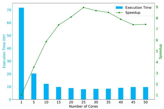 Figure 4 presents the variation in execution time and efficiency of the framework as a function of the number of cores used. In this study, speedup was employed as a metric to evaluate the parallel efficiency of the framework. As depicted in Figure 4, when the number of cores is below 25, there is a remarkable reduction in execution time as the core count increases, leading to a rapid increase in efficiency. However, when the core count exceeds 25, there is a slight increase in execution time and a corresponding decrease in efficiency. Under the conditions of this study, the optimal core allocation was found to be 25, yielding the highest efficiency with a speedup of 8.95.