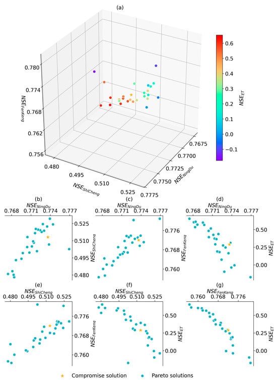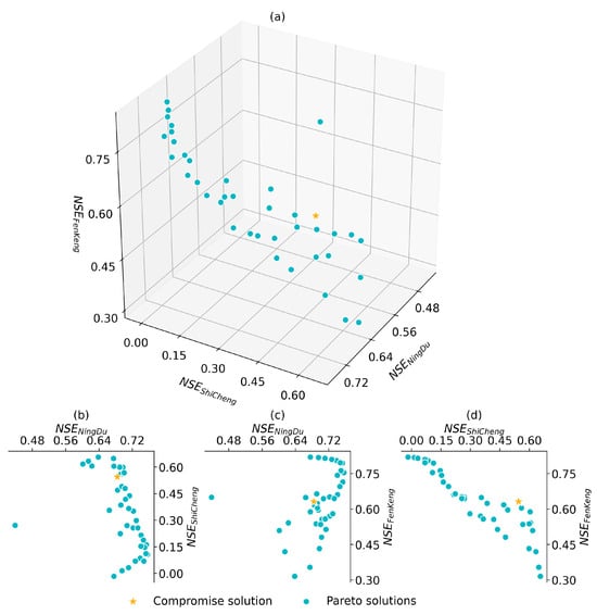 Scatterplot of the distribution of Pareto and compromise solutions in the objective function space: (a) Distribution of Pareto and compromise solutions in three-dimensional objective space, the x, y, and z axes represent the NSE of streamflow at the three hydrological stations, respectively; (b–d) Two-dimensional spatial projections of different objective functions.