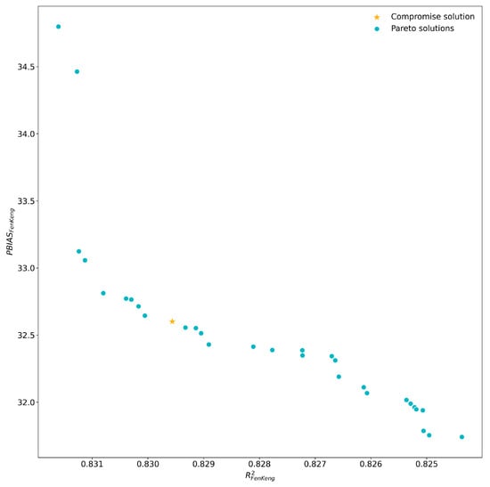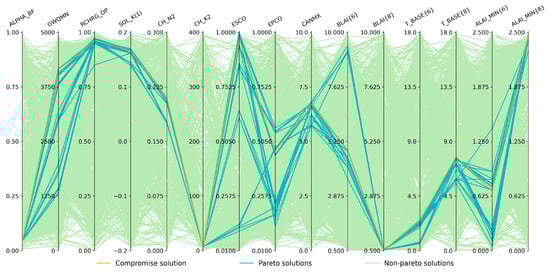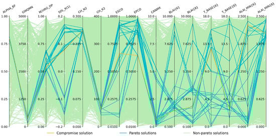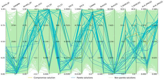 Figure 6 presents the distribution of parameter values corresponding to the Pareto and compromise solutions within the parameter space, depicted using parallel coordinate plots. The results indicate an appreciable narrowing in the parameter ranges for ALPHA_BF, GWQMN, SOL_K(1), ESCO, CANMX, BLAI{8}, and ALAI_MIN{8} across all Pareto-optimal solutions, suggesting a high degree of parameter identifiability for these parameters.