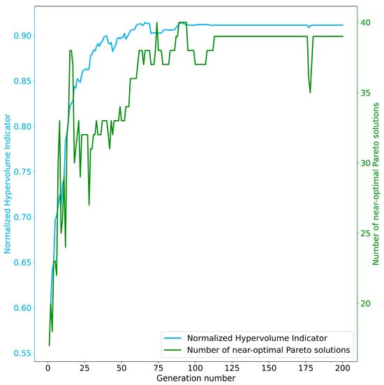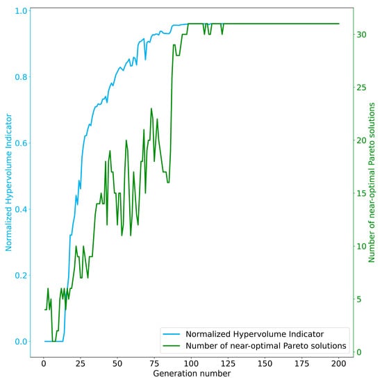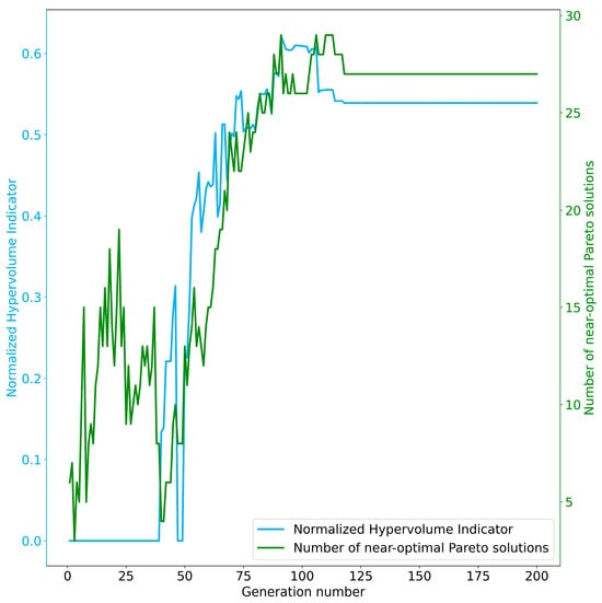 - Convergence Analysis: This employs the hypervolume indicator [], a commonly used metric for evaluating the approximations of the Pareto front (PF) generated by MOEAs []. A higher value of the hypervolume indicator indicates a better solution and the ideal value is one. The definition of the hypervolume indicator, its calculation, and cases in the space of the 2 objective functions are provided in S1 and Figure S1 in the Supplementary Materials;