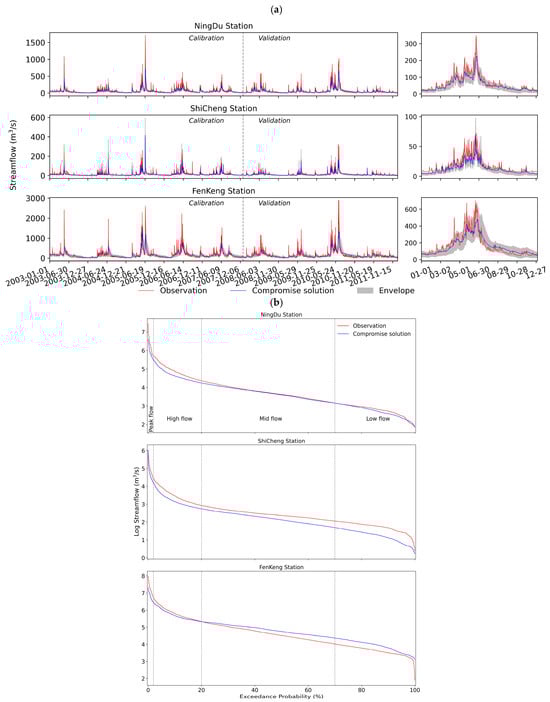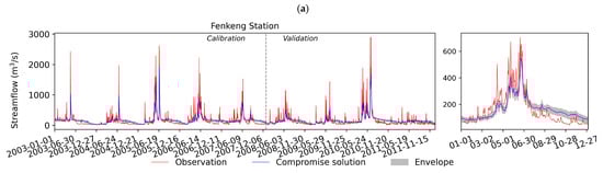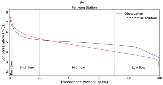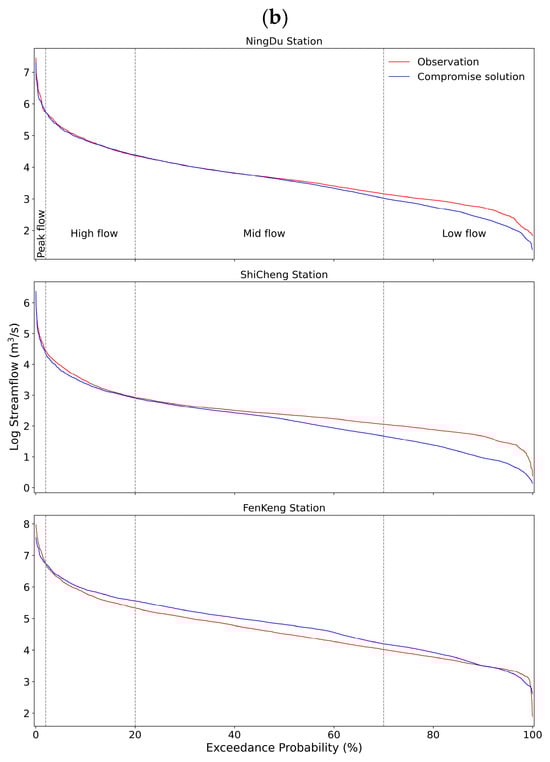 Figure 5 illustrates the distribution of Pareto and compromise solutions within a three-dimensional objective space, as well as the projection of different objective functions in a two-dimensional space. The figure shows a modest trade-off between streamflow at different stations, although the trade-off between Ningdu and Fenkeng stations is relatively weak.