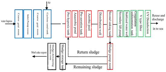 The Dkai plant is located on No. 6 Huanghai West Road, Jinzhou New District, Dalian City. It is a municipal sewage treatment plant that treats domestic and industrial wastewater (industrial wastewater exceeds 40%). It mainly accepts the municipal management of Maqiaozi Street, Dalian Economic and Technological Development Zone. Sewage from the network extends to Northeast 4th Street in the east, Tieshan West Road in the north, Binhai Tourist Road in the south, and Zhenxing Road in the west within about 23 km2. After treatment, it is discharged into the Yellow Sea. The built-up scale is 100,000 tons/day, and the total area is 70,774 square meters. The franchise period is from 21 August 2011 to 20 August 2041, spanning 30 years. This factory was built in 1988, more than 30 years ago, with a scale of 80,000 tons per day, and the design water discharge standard is secondary. In 2010, Henderson took over the expansion, upgrade, and transformation of the factory, and the scale was expanded to 100,000 tons/day; the water discharge standard was Class A, and the budget audit value was CNY 132 million. After upgrading in 2010, the process flow chart shown in Figure 1 was finally formed. According to Chinese authority, the Class A discharge standard volumes of pollutants for municipal wastewater treatment plants in terms of COD, BOD, SSs, TP, and TN are 50, 10, 10, 5 and 15 mg/L, respectively. The average daily treatment capacity is 63,000–66,000 tons/day. In addition to domestic sewage, there are 14 major sewage enterprises, with discharges ranging from 200 to 5000 m3/d, which are mainly electrical, machinery, building materials, pharmaceuticals, food, special glass, and dyeing processes. In this study, the influent TN parameter is selected to be predicted using other influential variables. The precise prediction of the influent total nitrogen variable is crucial and is selected as a case study because TN from the influent of WWTPs plays a significant role in the performance of nutrient removal systems, controlling sludge production, and the operation of different parts of wastewater treatment processes.