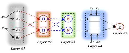 In which A1, A2 and B1, B2 are the membership functions (MFs) for x and y vectors, respectively, and p1, q1, r1 and p2, q2, r2 are the output function parameters. The neural network structure contains five layers, excluding the input layer (Layer 0):