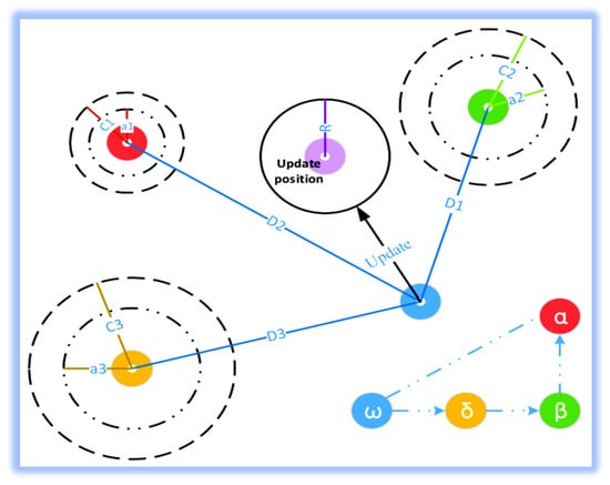 GWO is a recent swarm intelligence algorithm proposed by Mirjalili et al. [], whose approaches mimic the social structure and hunting techniques of the gray wolf (GW) herd. GW, which includes α, β, δ, and ω, are strictly hierarchical social animals (Figure 3). To achieve global optimization, the group head is responsible for assigning various tasks to individuals at varying levels. Because of its straightforward design, low requirement for parameter changes, and excellent performance, the GWO algorithm has found widespread use in optimization [,,,,].