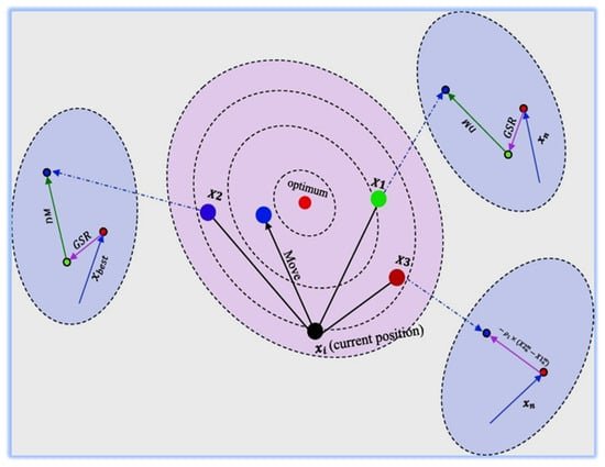 A few adjustments are required to control the search because the GSR is the method’s core component. Considering Equations (3)–(18), + x and x are denoted by the adjacent positions of . Within the GBO algorithm, position + x is less fit than , while x is more fit than . A stronger location within the positional vicinity () is substituted for the position by the x.