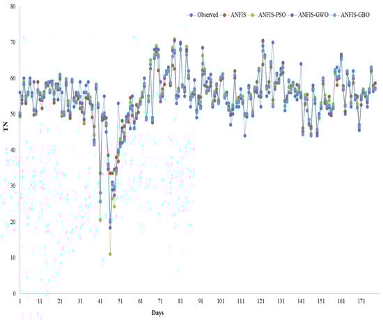 Time variation graphs of the observed and predicted TN by different ANFIS-based models in the test period using the best input combination: 7.