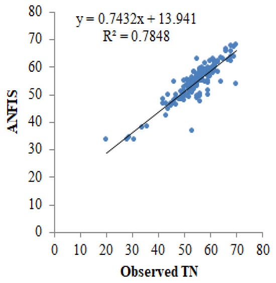 Table 3 presents the training and testing results of the ANFIS model for various input combinations. This shows the performance of the ANFIS model concerning each input combination and explains the best input combinations that give satisfactory results of TNinf. Table 3 clearly shows that input combinations (5), (6), and (7) outperformed input combinations (1–4) significantly. The ANFIS-7 model proved that input combination (7) displayed marginally superior performance compared to input combination (5) and (6). In the training and testing phases, this model with the seventh input combination generated the smallest RMSE (2.2442 and 3.4275) and MAE (1.7273 and 2.2720), as well as the greatest NSE (0.8722 and 0.7824) and R2 (0.8722 and 0.7848).