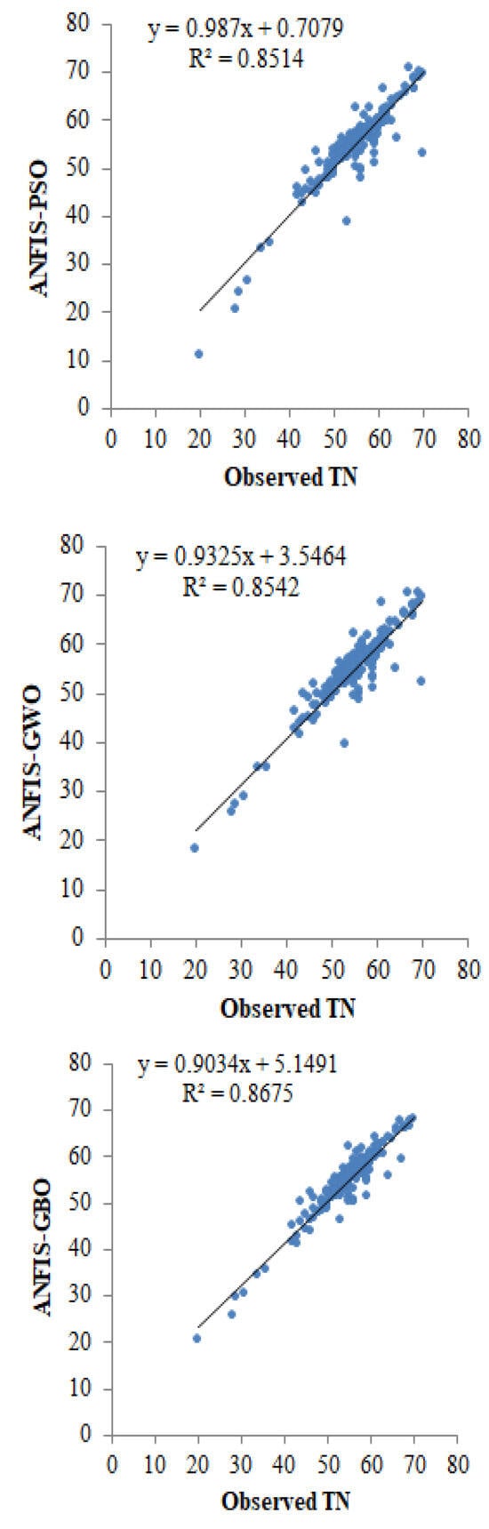 Scatterplots of the observed and predicted TN by different ANFIS-based models in the test period using the best input combination: 7.