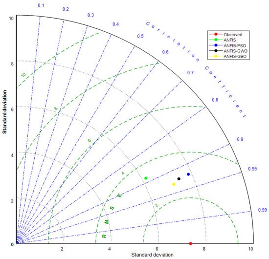 A Taylor diagram of the predicted TN by various ANFIS-based methods during the testing stage with the best input combinations is shown in Figure 7. This graphical technique, which displays three statistics, i.e., correlation coefficient, standard deviation, and root-mean-squared error, on a single graph is beneficial for evaluating model performance. It is clear from the diagram that the 7th input shows good prediction results for all models. As can be observed from the Taylor diagrams for the 7th input case, the hybrid ANFIS-GBO has a lower standard deviation and RMSE to the observed one and a higher correlation than the other ANFIS-based methods. It was followed by the ANFIS-GBO, ANFIS-GWO, and ANFIS-PSO methods in terms of accuracy.
