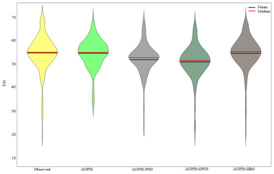 Violin charts of the predicted TN by different ANFIS-based models in the test period using the best input combinations.