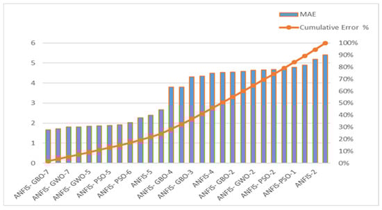 Pareto chart of all ANFIS-based models for the all input combinations using testing data.