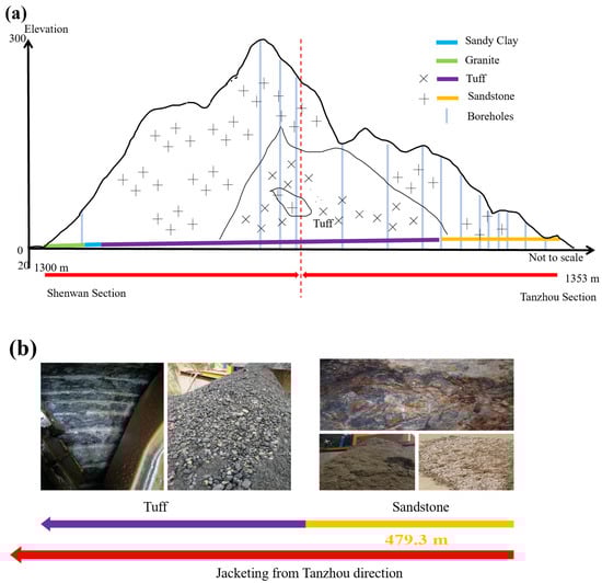 The water pipeline project took place in the suburban area of Zhongshan City, which is located on the mountain Tielushan. The main peak of Tielushan has an elevation of 474 m. During the pipe jacking process, the minimum overburden thickness is only 3 m, while the maximum overburden thickness reaches 286 m. On the west side, in the Shenwan section, the pipe jacking traverses sandy clay, granite, and tuff layers. On the east side, in the Tanzhou section, the pipe jacking primarily encounters sandstone and tuff layers. Additionally, the tuff formations exhibit developed fracture zones and contain a significant amount of fissure water. The overall geological conditions of the pipe jacking path are illustrated in Figure 1. In this study, we focus on the Tanzhou section, in which the majority of the stratum encountered during the jacking process is sandstone and tuff formations (Figure 1b).