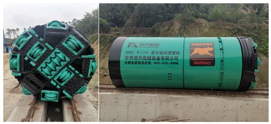 Based on the characteristics of the rock strata (self-stabilizing excavation face and permeability coefficient greater than 10−7 m/s) and the requirements of pipe jacking (such as secondary crushing capability and convenient cutter replacement), slurry balance tunnel boring machines equipped with disk cutters for rock-breaking are chosen in rock pipe jacking projects. In the Tanzhou Section, the HRC 1500 rock tunneling machine, produced by Tangxing Equipment, is chosen. It has an outer body diameter of 1.82 m and a cutterhead cutting diameter of 1.88 m, powered by six hydraulic jacks. Front views of the tunneling machine heads are shown in Figure 2.