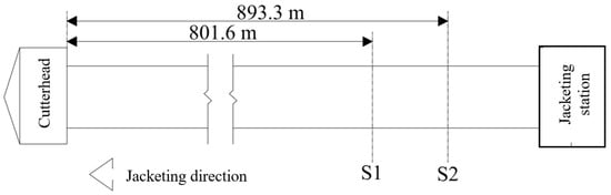 To understand the stress conditions of the steel pipe sections in the long-distance hard rock pipe jacking project, strain monitoring was conducted during the mid-to-late stages of the east Tanzhou section. Monitoring sections were set up at the 80th and 90th pipe segments, S1 and S2, respectively. The S1 section is located 801.6 m behind the machine head, while the S2 section is 893.3 m behind the machine head (Figure 4).