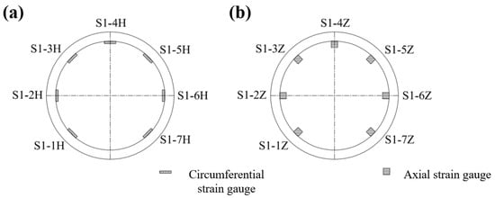 Layout of cross-section measurement points for the (a) circumferential strain gauge and (b) axial strain gauge.