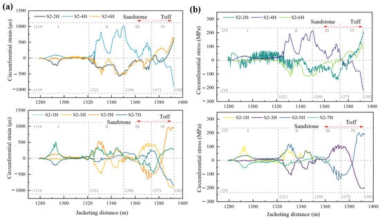 The variation curves of circumferential strain at different measurement points along the S2 monitoring section with jacking distance are shown in Figure 7. The circumferential stress trends at these points also align with the strain trends. Due to the failure of the axial strain gauges at the lower left (S2-1H) and lower right (S2-7H) points during the late stage III, the subsequent axial strain values at these points could not be measured. Consequently, the circumferential stress values after 1352 m for S2-1H and after 1364 m for S2-7H cannot be calculated. To facilitate description of the curves, the entire monitoring segment is divided into four stages based on the changes in the curves: Stage I (1279 m to 1321 m), Stage II (1321 m to 1350 m), Stage III (1350 m to 1373 m), and Stage IV (1373 m to 1392 m).