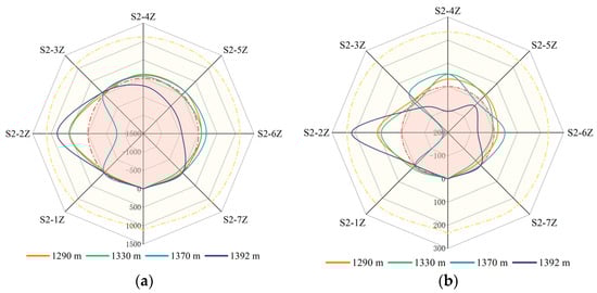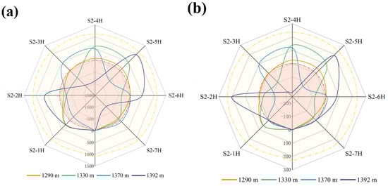 When jacking reaches Stage IV, strain at all measurement points transitions from tensile to compressive or vice versa. The monitoring section transitions from sandstone to tuff when the jacking distance reaches 1373 m. The change in surrounding rock type directly alters the stress state around the pipe, causing strain at each measurement point to reverse. At this stage, the overall strain pattern in the monitoring section is compressive at the top and bottom and tensile on the sides. As shown in the cross-sectional view of the annular strain state at different stages (Figure 8), with the increasing jacking distance, the monitoring section of the pipe segment tends to deflect towards the upper right. It is speculated that rock debris continuously accumulates at the lower left side of the pipe and, together with the slurry, raises the pipe segment. Additionally, the correction at the machine head in the earlier stage also contributes to the contact between the upper right side of the pipe segment and the surrounding rock.